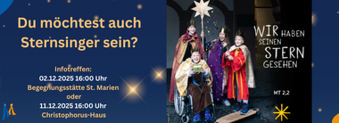 Für die Sternsingeraktion im nächsten Jahr suchen wir wieder Kinder und Jugendliche, die die Menschen in unserer Gemeinde als Sternsinger besuchen möchten. Auch Kinder mit Besonderheiten sind herzlich willkommen. Wir freuen uns über jede und jeden, der mitmacht!