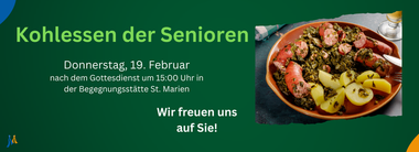 Am Do., 19.02.2026, nach dem Gottesdienst um 15:00 Uhr in der St.-Marienkirche, servieren wir in der Begegnungsstätte echten Oldenburger Grünkohl mit Kochwurst, Pinkel und Kassler. Ein Schnaps darf natürlich auch nicht fehlen.