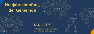 Auch das neue Jahr möge mit dem Segen Gottes beginnen. Dies möchten wir gemeinsam feiern am So., 12.01.2025. Um 11:00 Uhr feiern wir die Heilige Messe in der St.-Marienkirche, daran schließt sich der Neujahrsempfang unserer Kirchengemeinde in der Begegnungsstätte an.